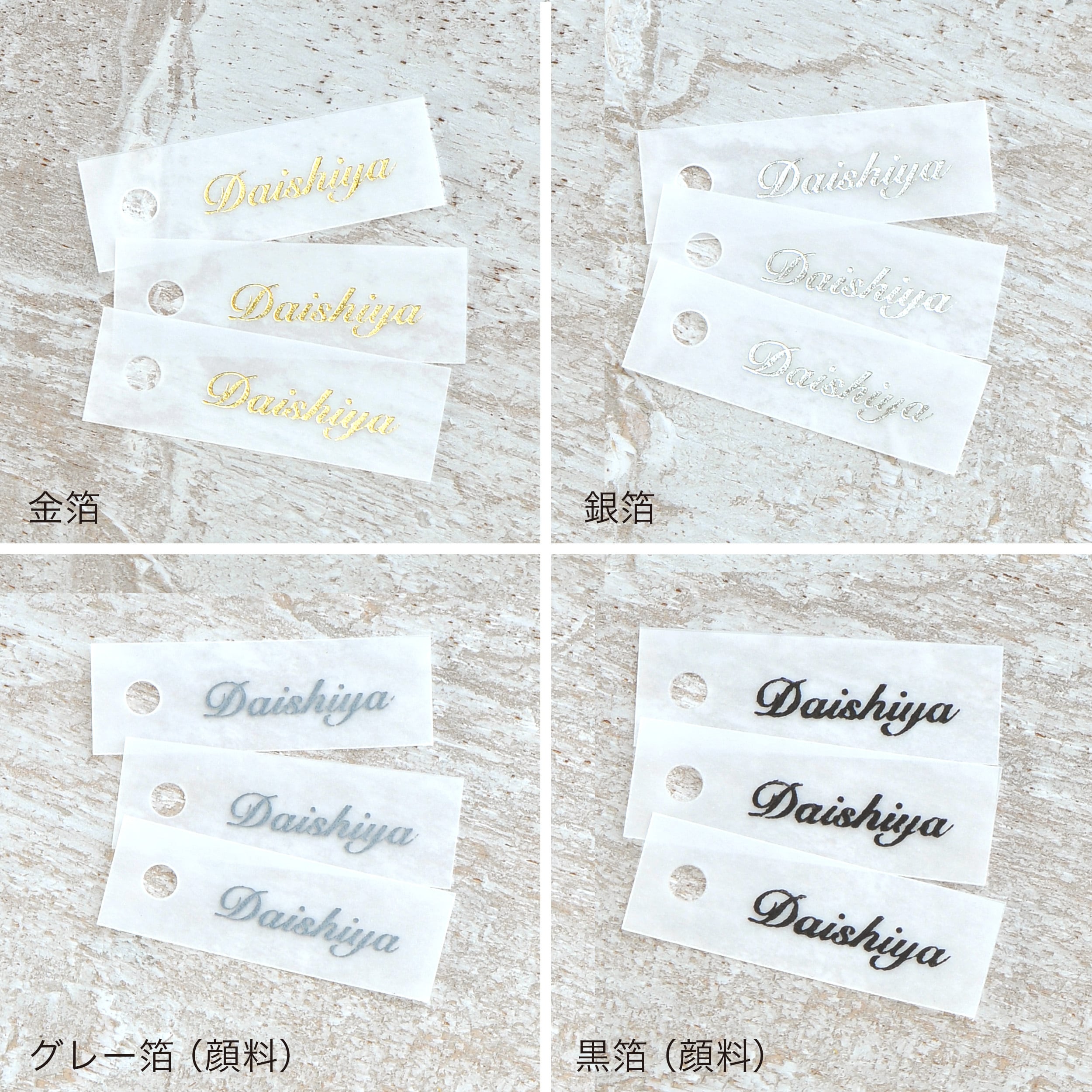 箔押しは印刷やスタンプよりも高級感があり、本格的なショップのタグに仕上がります。