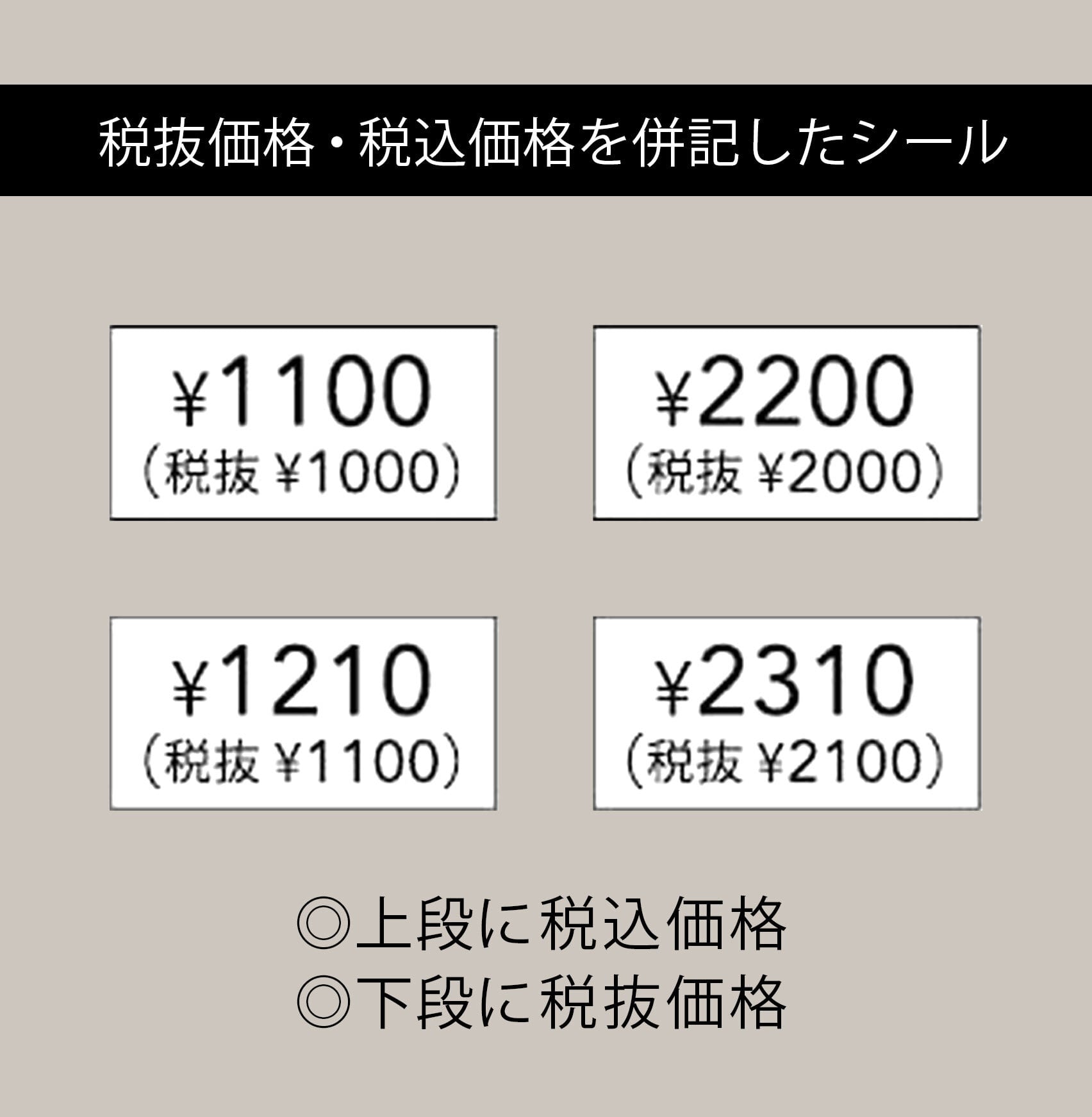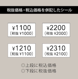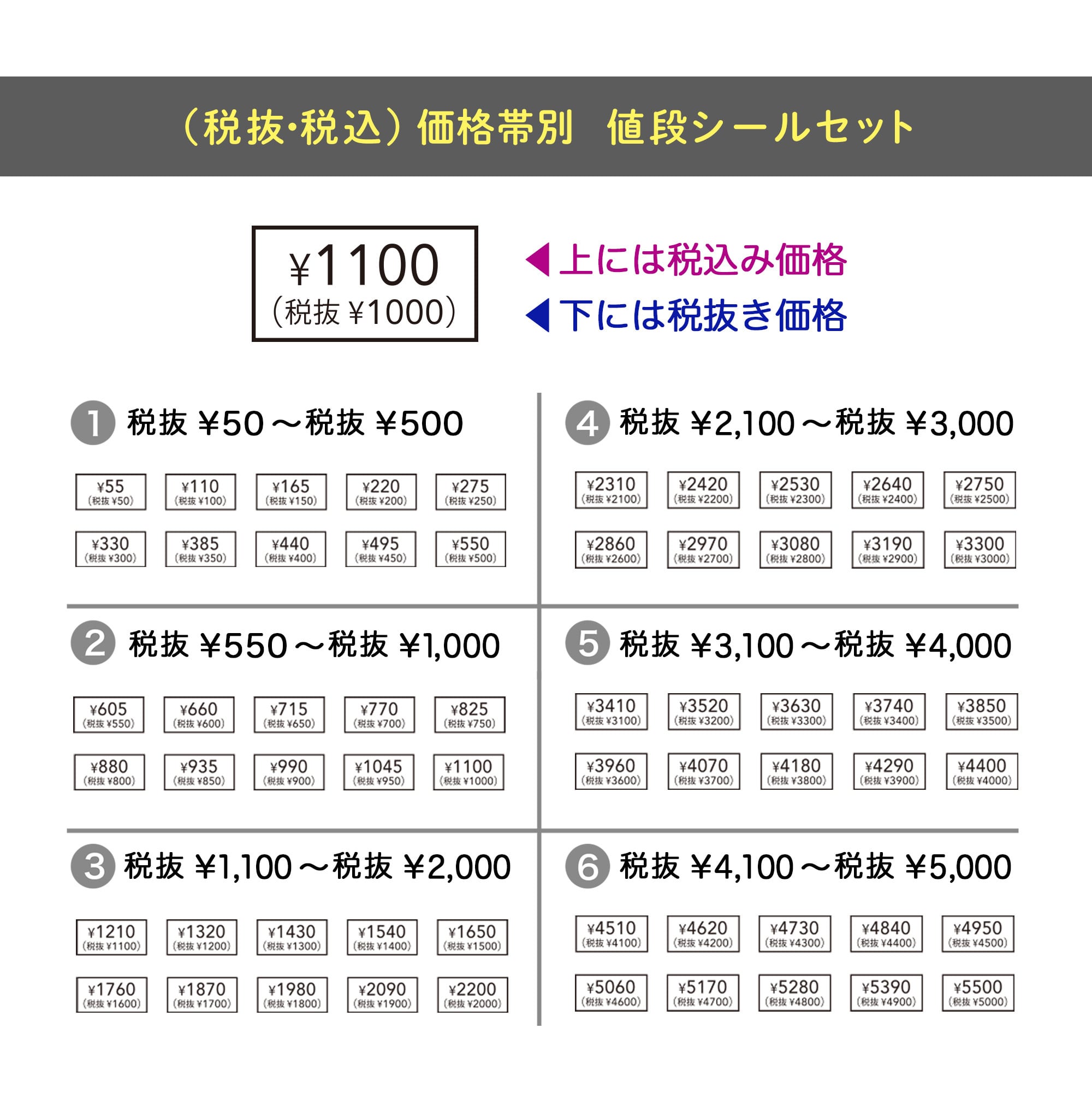 税抜で1000円以下、2000円台など価格帯でおまとめした便利な(税抜・税込を併記の)プライスシールセットです。
