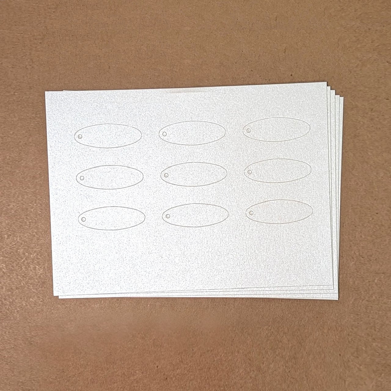 キラキラと繊細に輝くパール紙で、楕円形のタグを作りました。ライトに反射して輝き、お客様の目をひきます。