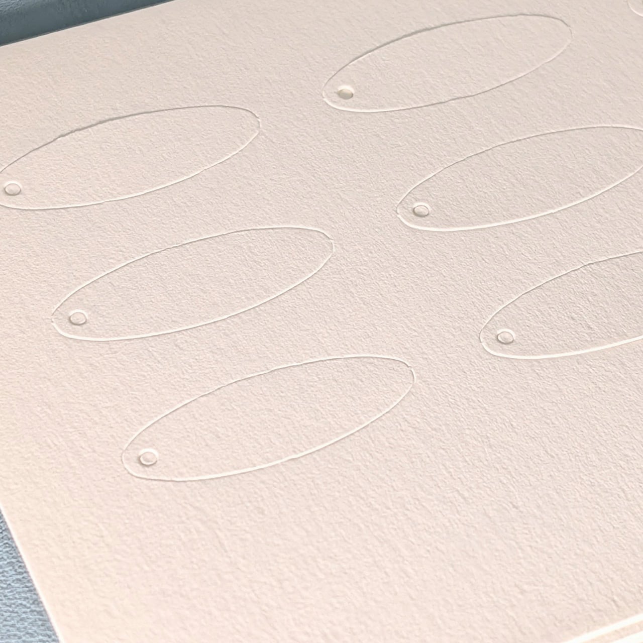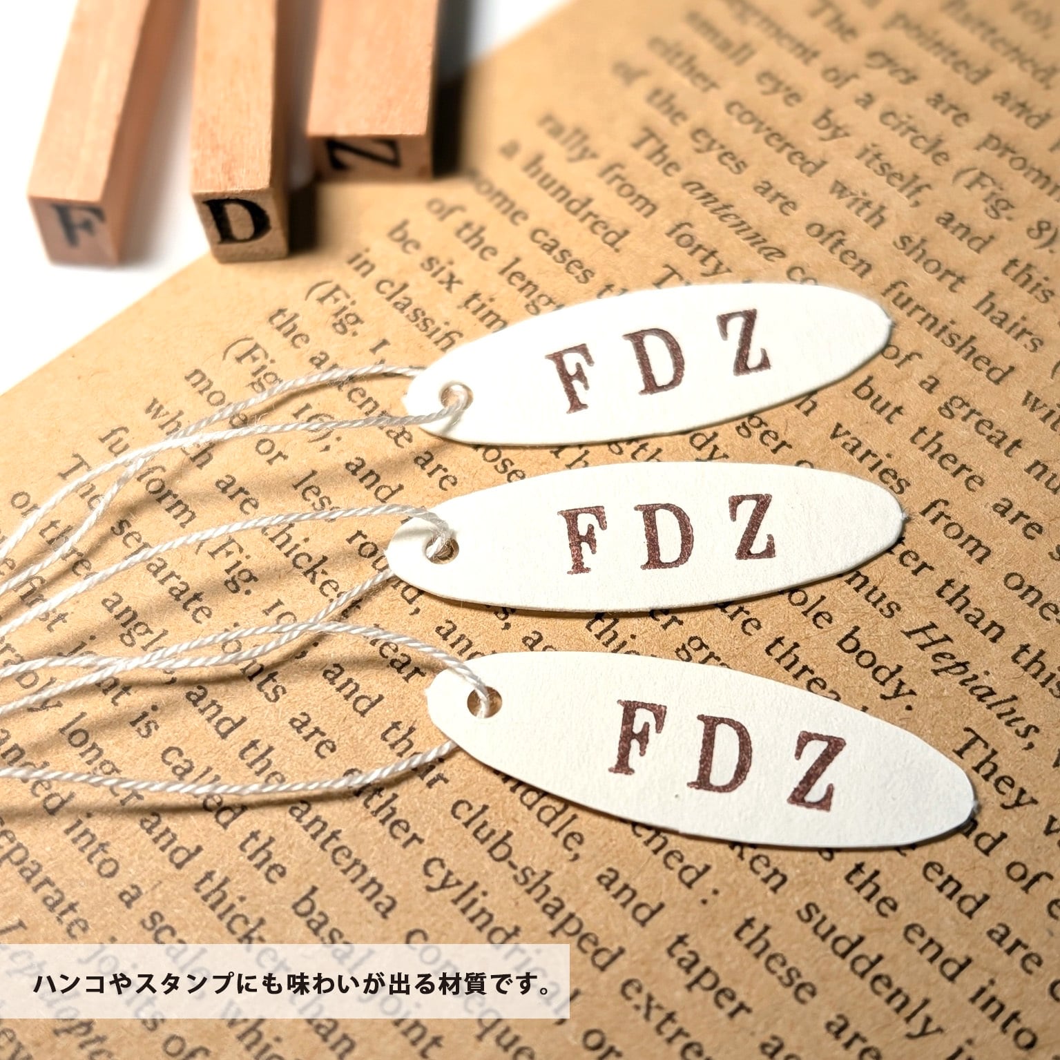 コットンのような風合いの厚紙で、楕円形のタグを作りました。丸みのある形が可愛らしく、つい触ってみたくなる仕上がりです。どこか優しげで温もりのある印象を与えてくれます。