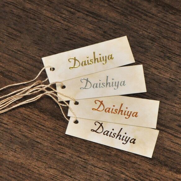 箔押しは印刷やスタンプよりも高級感があり、本格的なショップのタグに仕上がります。