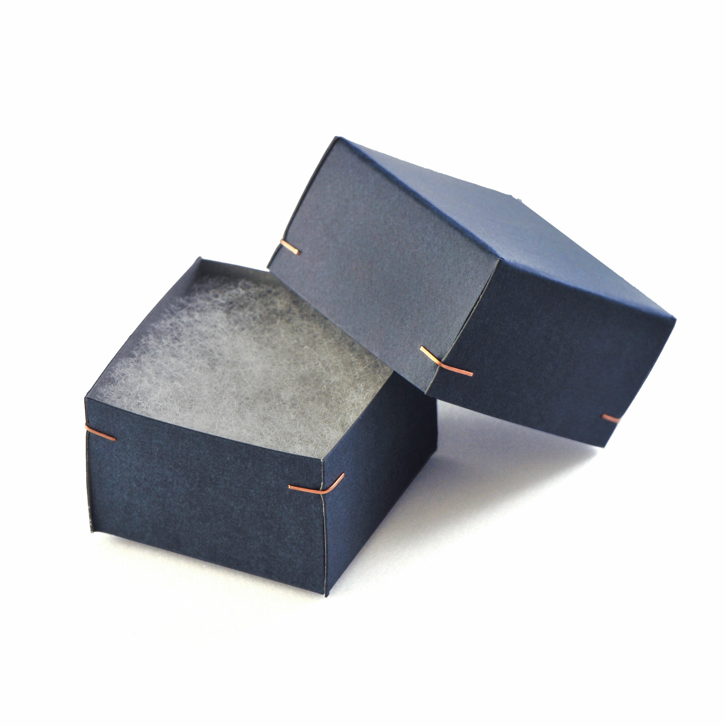 箱の四隅を針金で直角に留める、昔ながらの製法で作られた紙箱です。