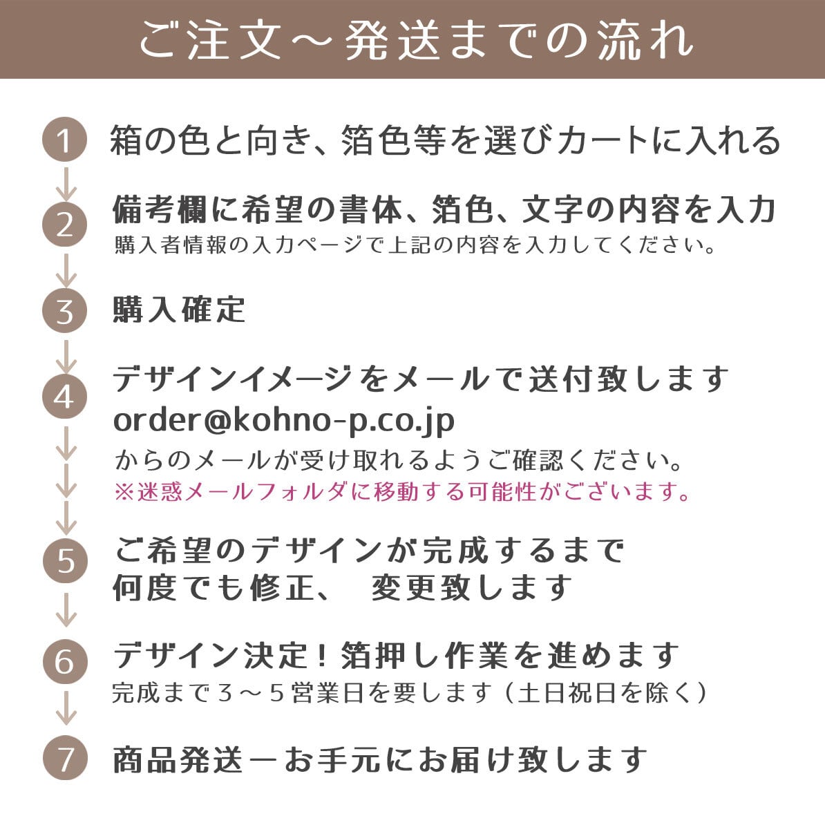 箔押しの名入れは印刷やスタンプよりも高級感があり、本格的なショップのギフトボックスに仕上がります。