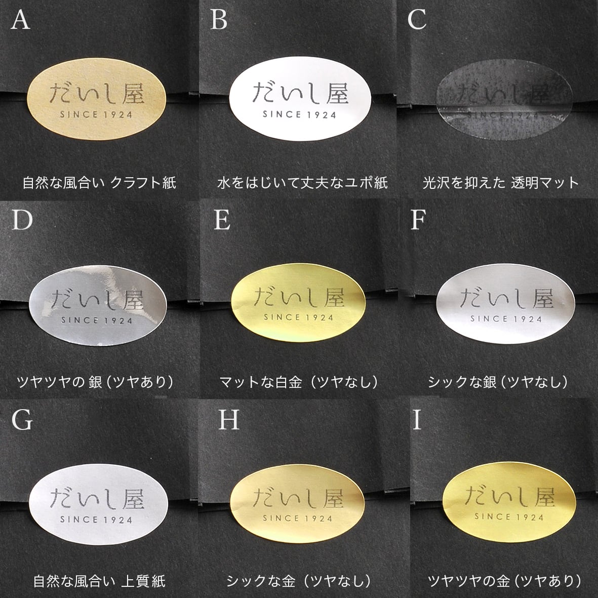 ■材質:クラフト紙、ユポ紙、上質紙、透明マット、銀(ツヤ無し)、銀(ツヤあり)、白金、金(ツヤなし)、金(ツヤあり)から選択