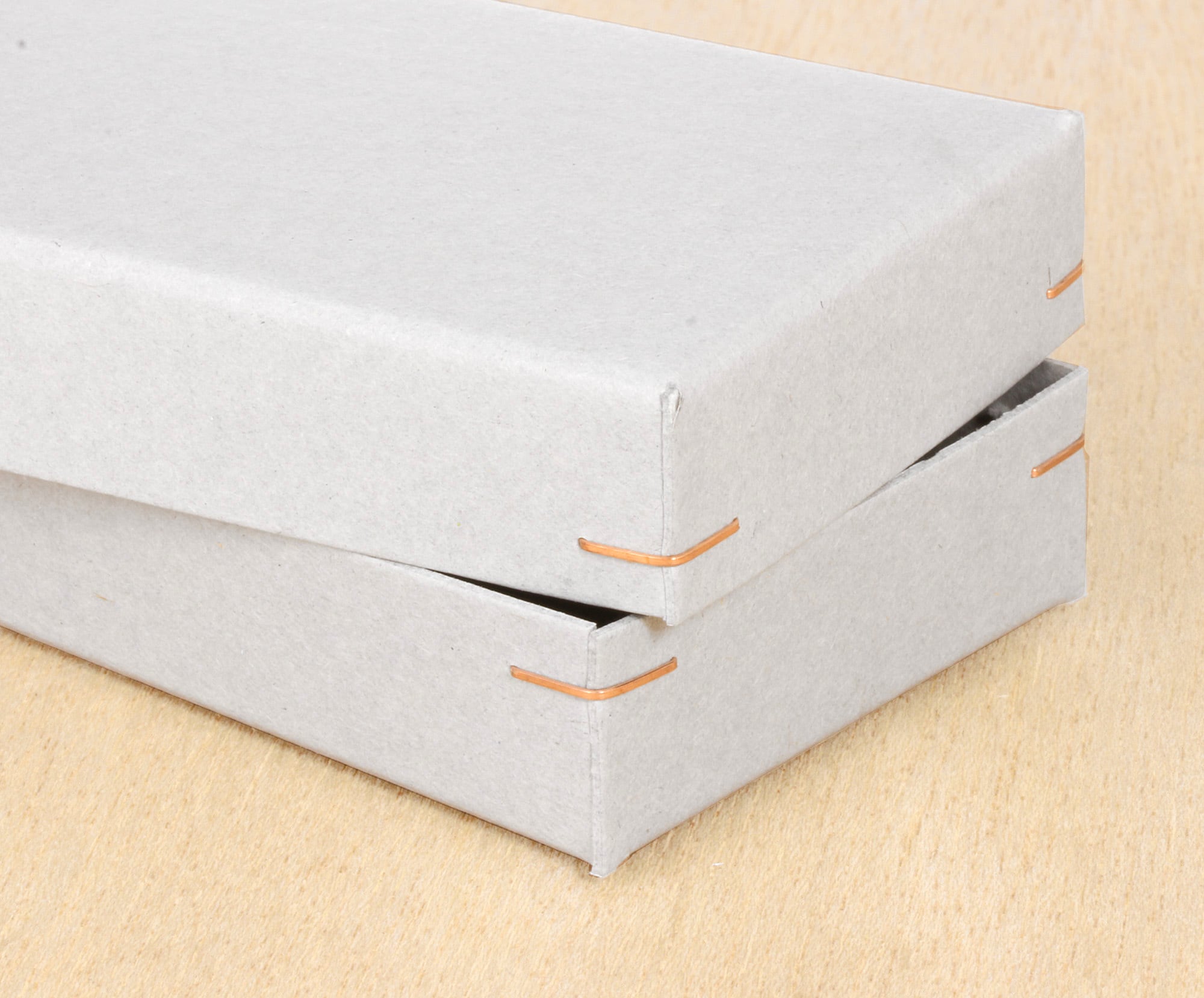 箱の四隅を針金で直角に留める、昔ながらの製法で作られた紙箱です。